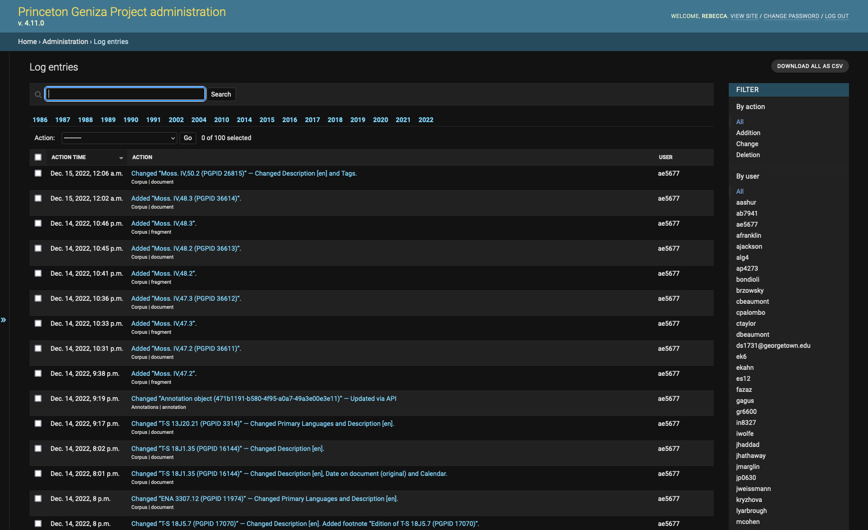 Rebecca also shared how they have implemented exports to make some of the information from the database available in CSV format. Admin users can export all or a filtered subset right from the admin interface, but they also have a cron job that synchronizes the CSV files to a data repository on GitHub (for example, see https://github.com/princetongenizalab/pgp-metadata with data exported from Princeton Geniza Project). This will be the basis for dataset publication, but it also makes the data available for viewing, filtering, and downloading with GitHub’s Flat Viewer.