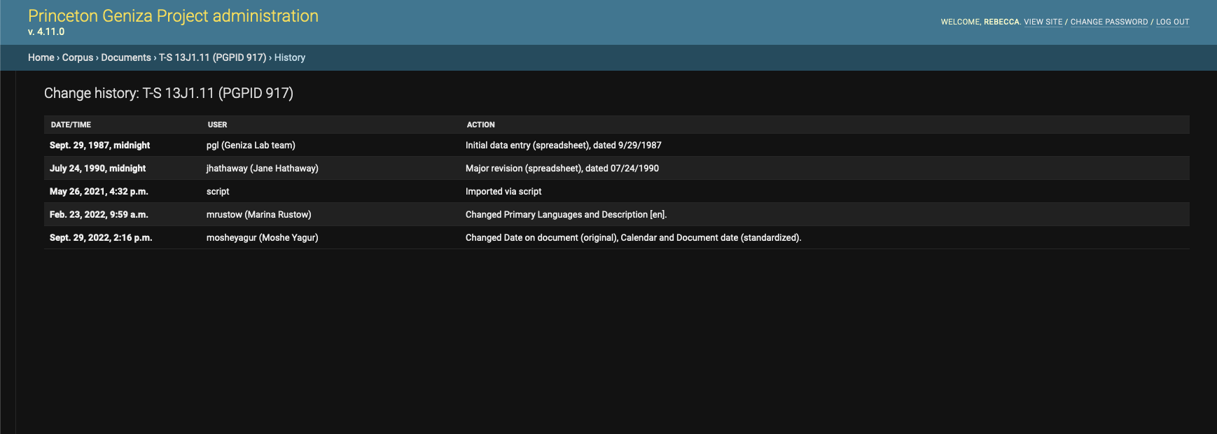 Screenshot of the Django Admin history for a document in the Princeton Geniza Project showing entries for record creation before the current database existed, scripted import into the database, and edits since then